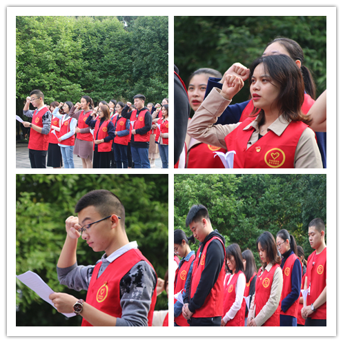 各位学生党员拾级而上,怀着无比崇敬的心情来到革命烈士墓,每位同学都心潮澎湃、思绪万千。活动伊始,主持人面对着高大雄伟的纪念碑为革命烈士致悼词,全体同学围聚在肃穆的纪念碑前深情凝望,一句句悼词在耳畔边回响着,面对着为祖国无私奉献而牺牲的革命烈士,每位同学不禁肃然起敬。在主持人的组织下,同学们举起右手,由领誓人带领着大家在革命烈士纪念碑下,以青春的名义进行庄严宣誓,那一字字承诺彰显着同学们对党的忠诚信仰,那一声声誓言象征着同学们对未来的无限憧憬。在庄严宣誓后,同学们低头默哀,缅怀在那段战火纷飞的岁月中为中国的民族解放和人民革命事业英勇献身的革命先辈们。