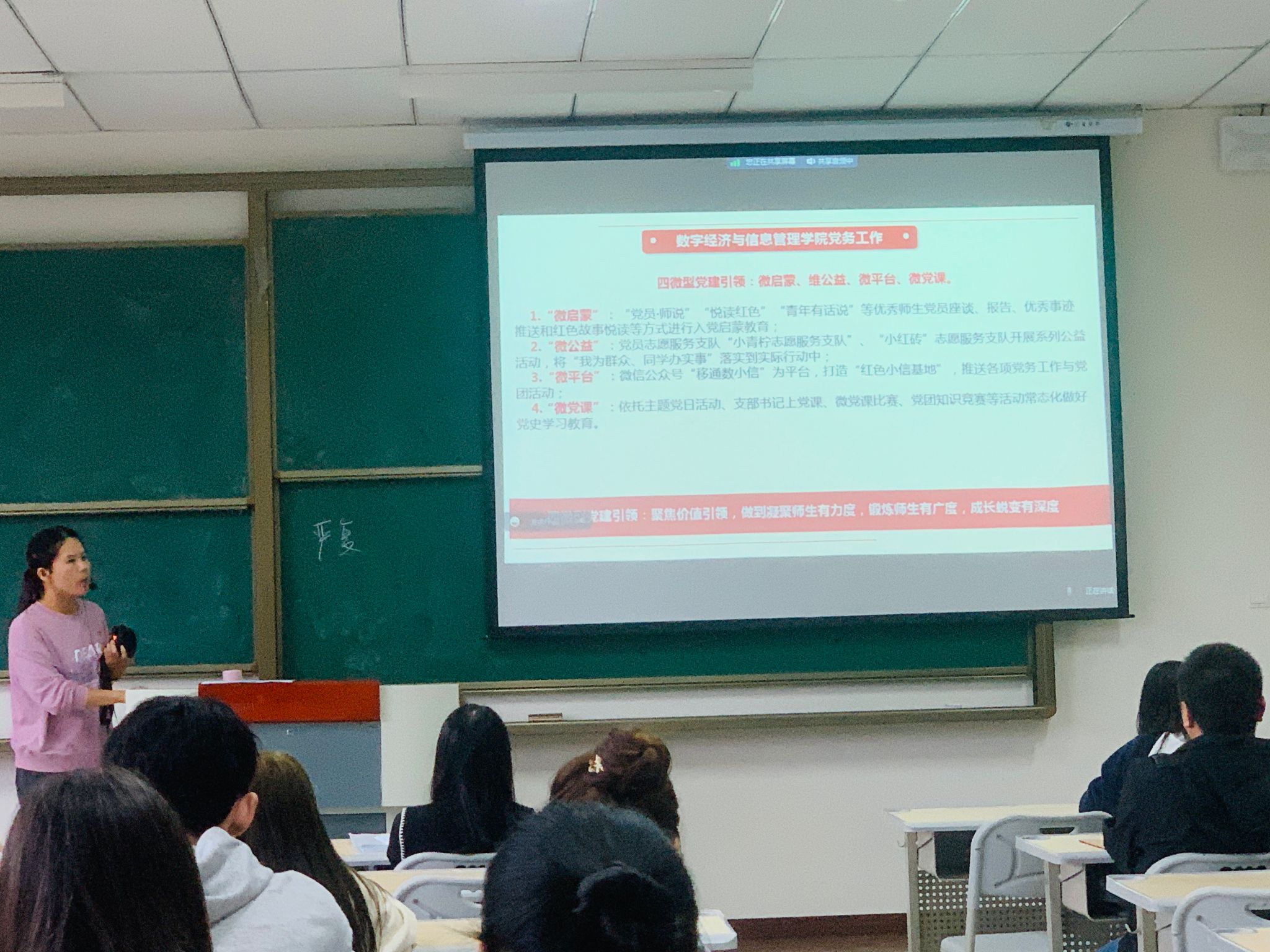 为深入学习贯彻习近平新时代中国特色社会主义思想,巩固深化学习教育成果。根据学院党总支工作安排,9月27日15:00,数字经济与信息管理学院学生第一党支部书记任瑞娟在双栀书院301教室为学生党支部党员讲授题为“习近平新时代中国特色社会主义思想三十讲之努力掌握马克思主义思想方法和工作方法”的党课。数字经济与信息管理学院学生党支部全体党员通过线上、线下两种形式参加了本次大会。