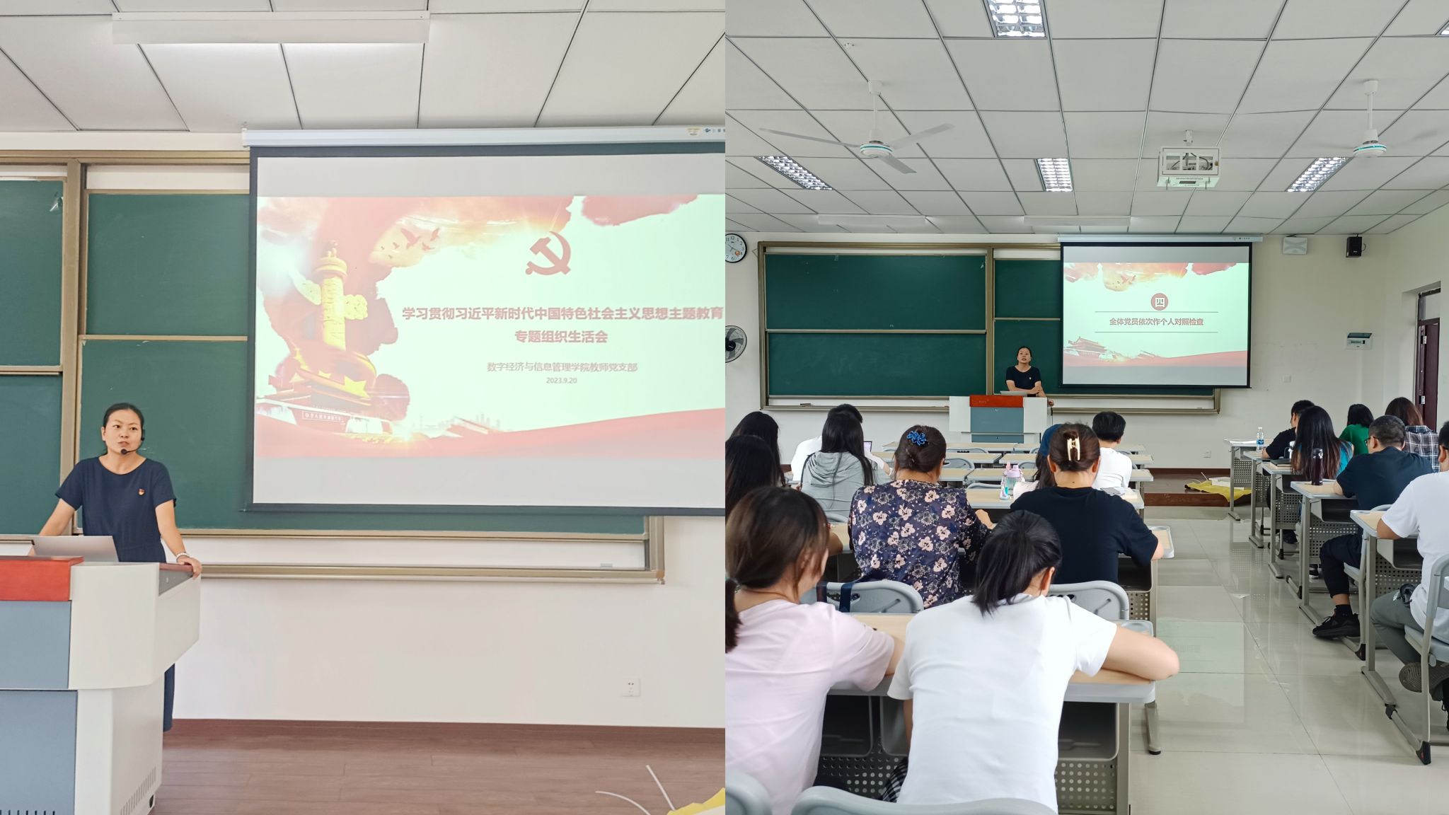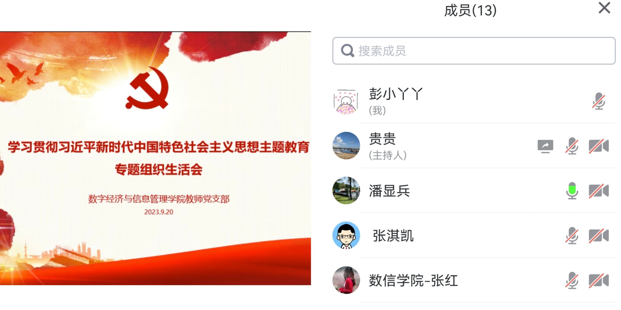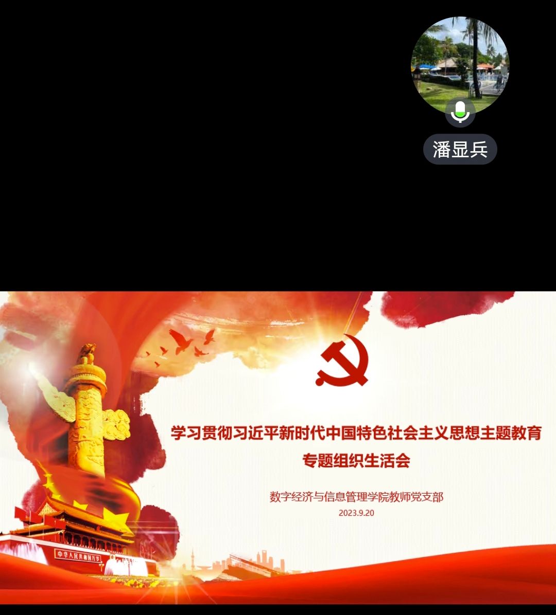 按照市委教育工委部署要求及我校党委对主题教育工作相关要求。数字经济与信息管理学院教师支部于9月20日14:00召开了学习贯彻习近平新时代中国特色社会主义思想主题教育专题组织生活会。党总支书记潘显兵同志、支部书记刘贵容同志及教师支部全体党员同志参会,会议由支部书记刘贵容同志主持。 会议采取腾讯会议+双栀403同步举行的线上线下融合方式,綦江校区线上参与,合川校区线下参与。
