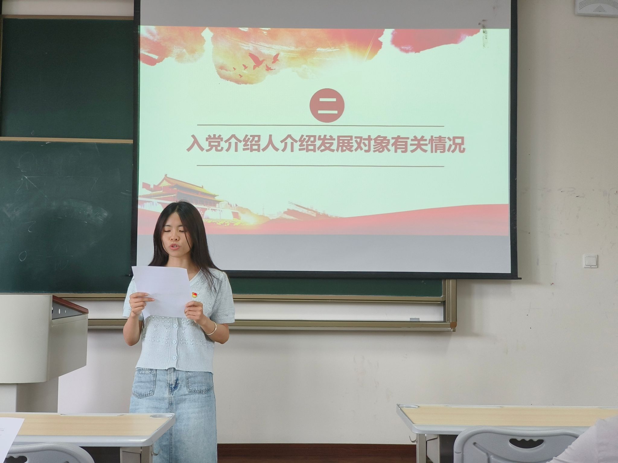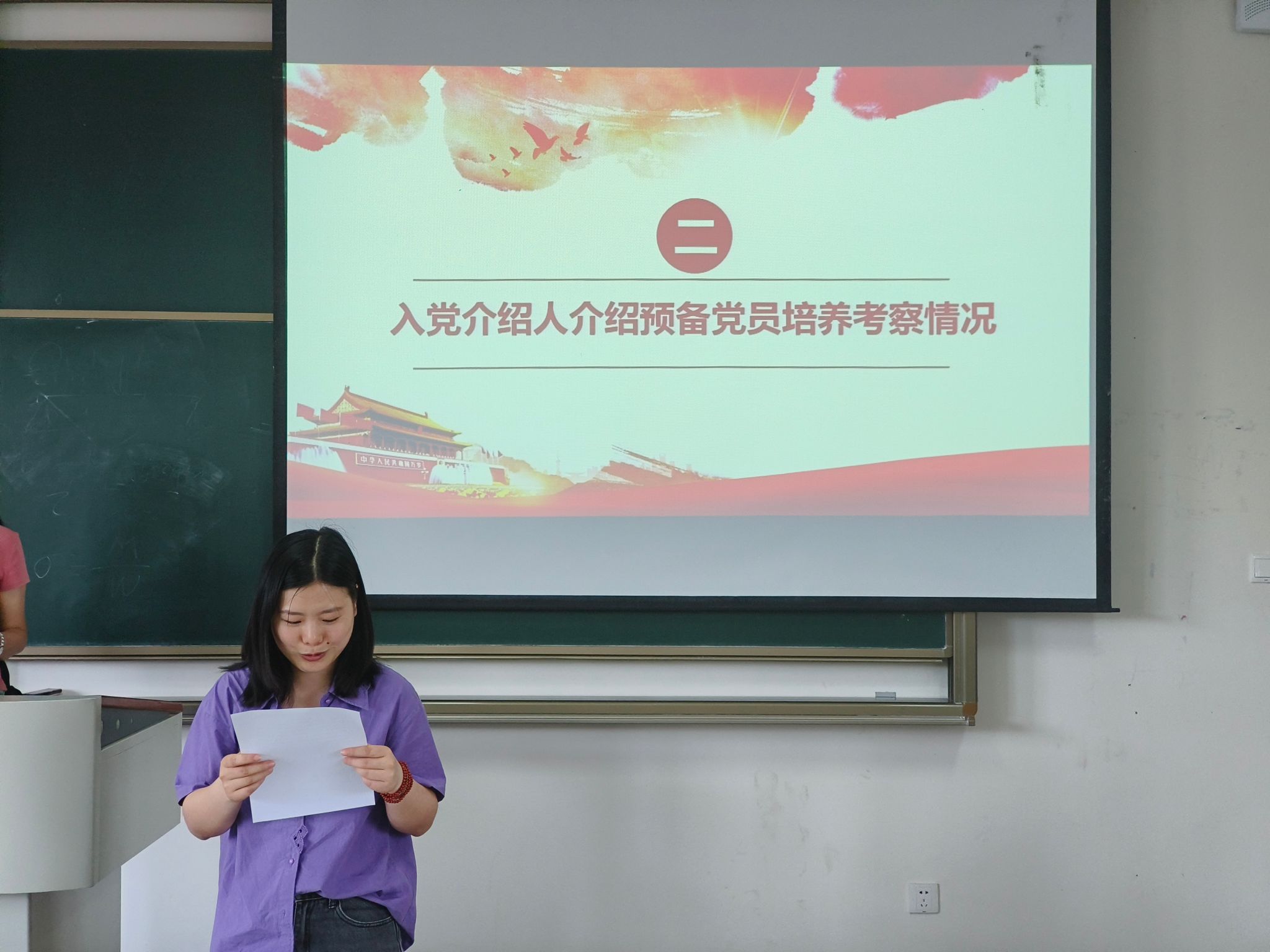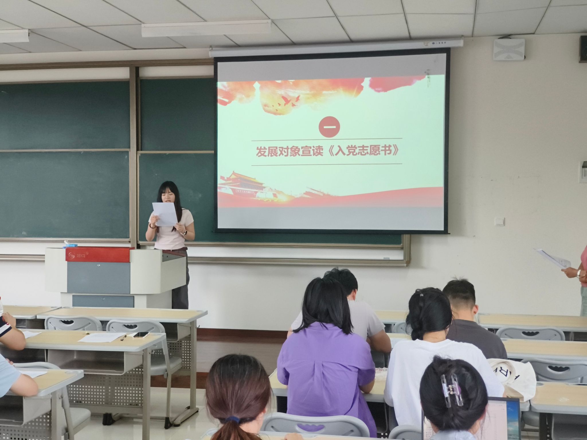在会议第二部分,发展对象李竺奕同志宣读了入党志愿书,并向大会详细报告了自己情况,表示将在今后的学习和工作中坚定信念,时刻以一名合格共产党员的标准严格要求自己。随后,经过入党介绍人、支委会及与会党员的重重讨论,就对是否接收李竺奕同志成为预备党员进行了无记名投票,投票结果为党支部成员一致同意接收李竺奕同志成为中共预备党员。接着,李竺奕同志进行了入党宣誓。