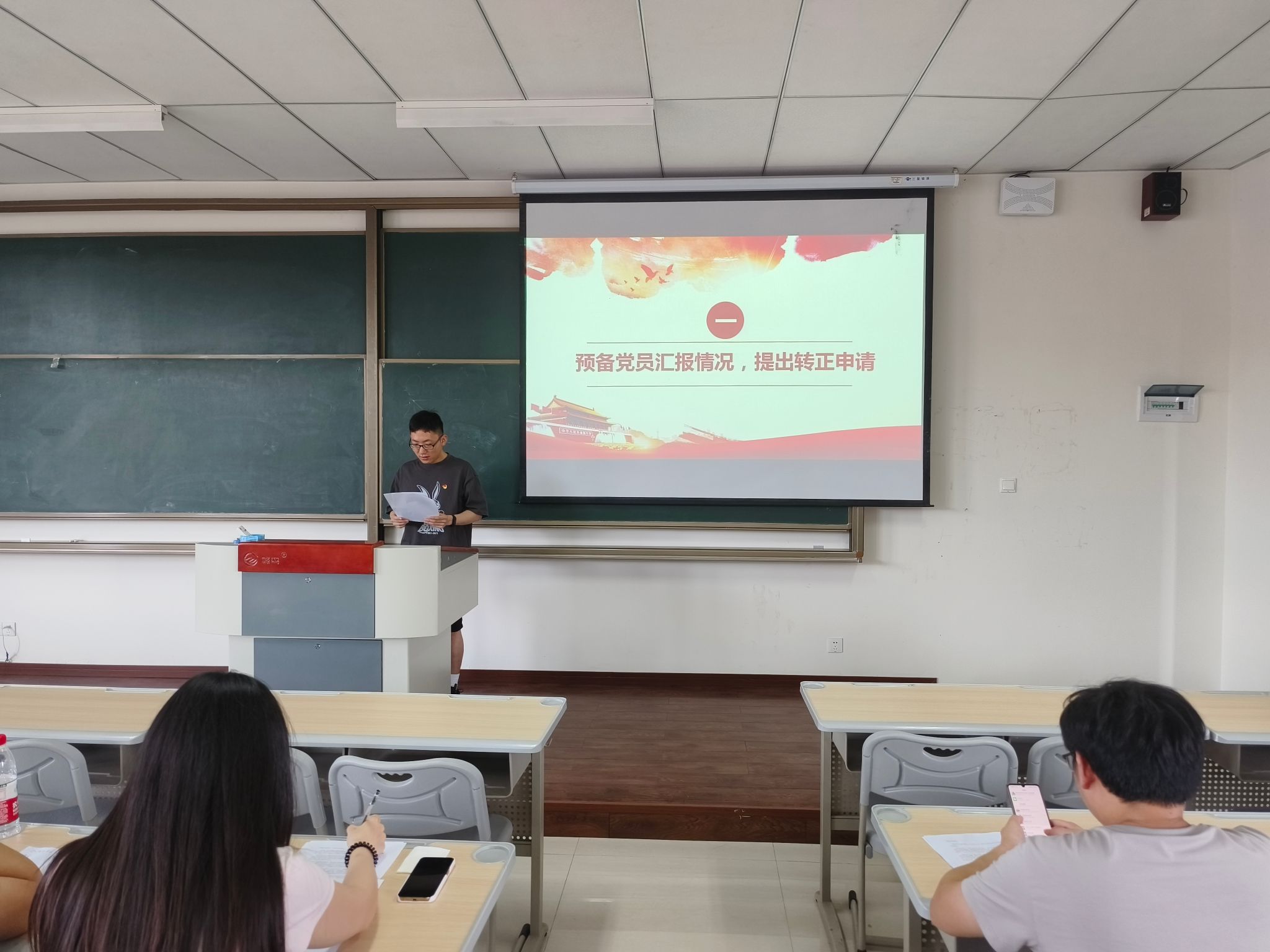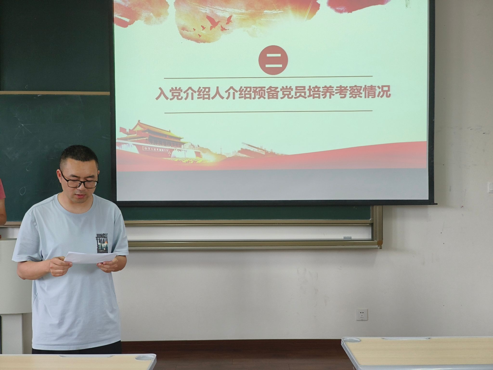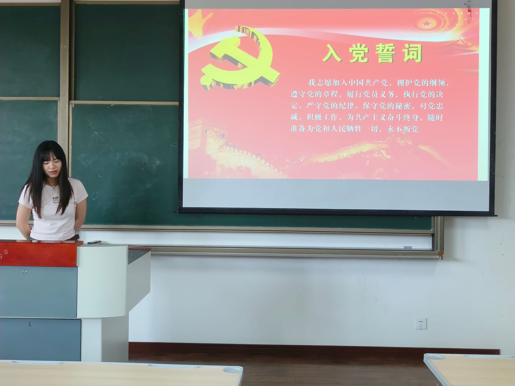 在会议第二部分,发展对象李竺奕同志宣读了入党志愿书,并向大会详细报告了自己情况,表示将在今后的学习和工作中坚定信念,时刻以一名合格共产党员的标准严格要求自己。随后,经过入党介绍人、支委会及与会党员的重重讨论,就对是否接收李竺奕同志成为预备党员进行了无记名投票,投票结果为党支部成员一致同意接收李竺奕同志成为中共预备党员。接着,李竺奕同志进行了入党宣誓。