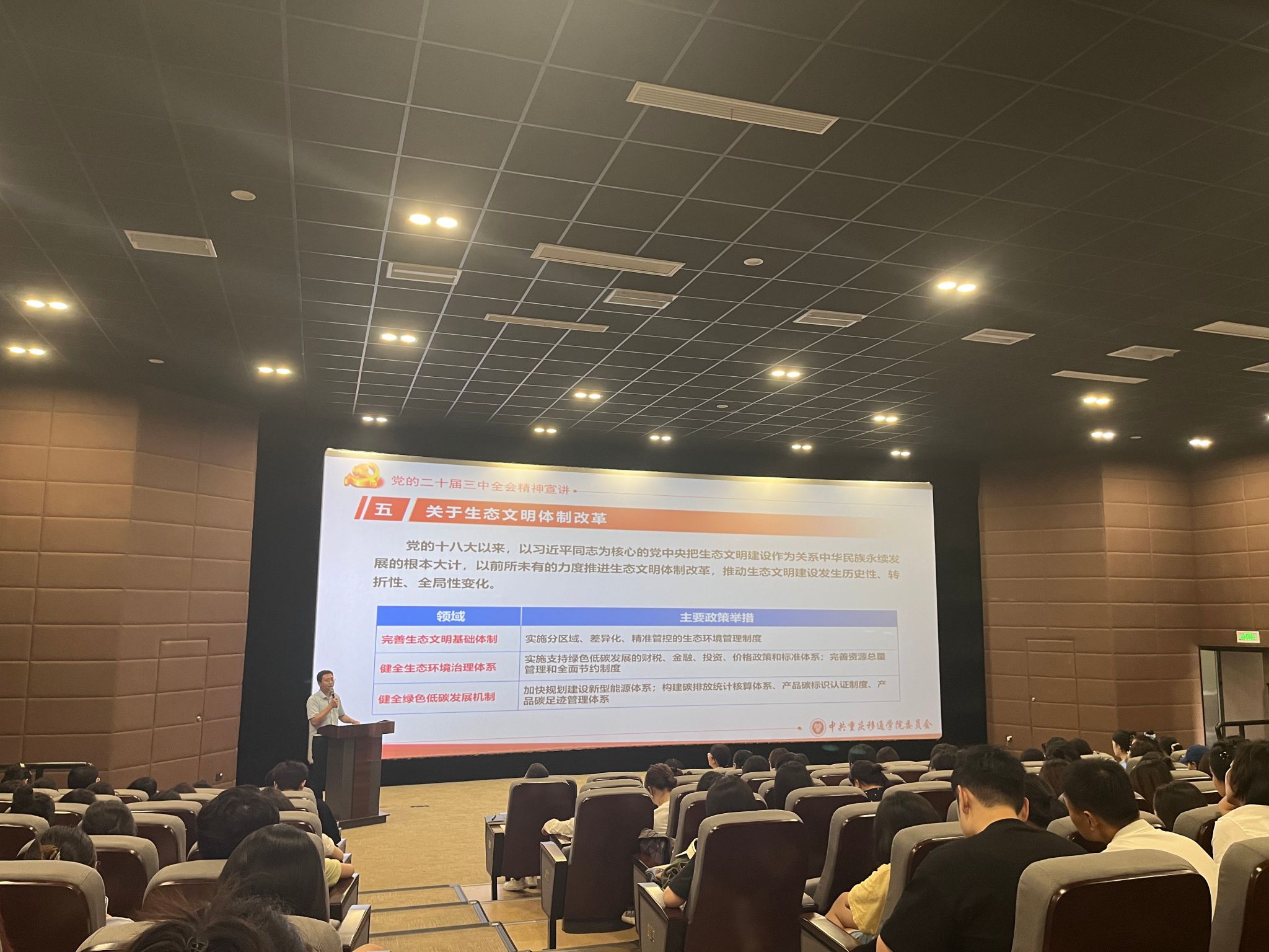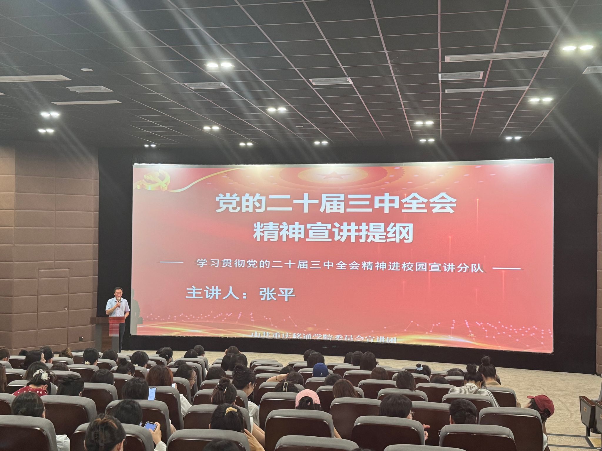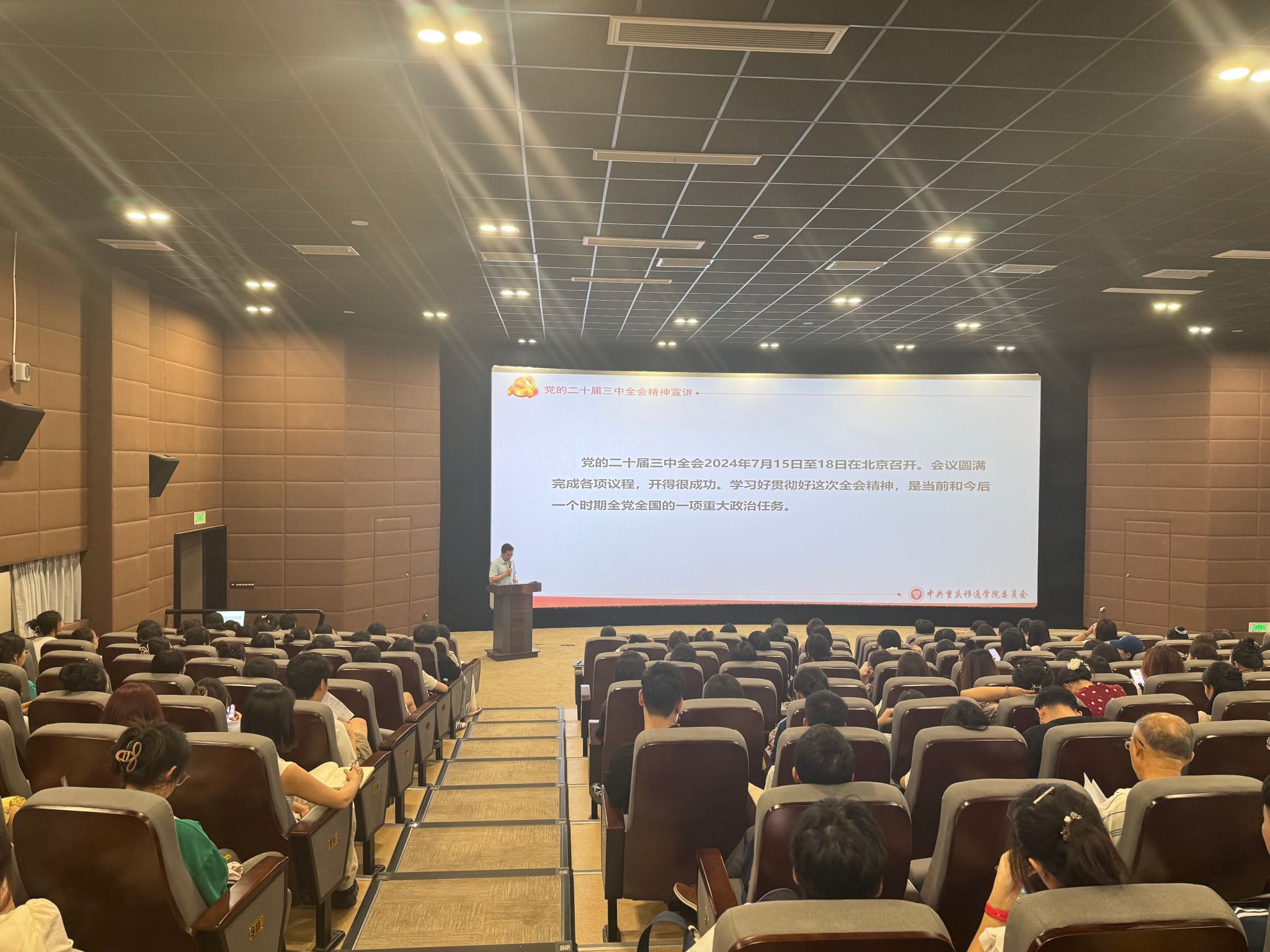 为深入学习贯彻党的二十届三中全会精神,进一步强化责任担当,淬炼商学院党总支举办了党的二十届三中全会精神宣讲会。本次会议于9月18日下午15点30分在六度空间电影厅举行,淬炼商学院党总支书记张平担任本次宣讲会的主讲人,参会人员包括淬炼商学院、国际商学院、冲突营销学院、电影商务产业学院以及新商科教学部的全体教师和学生代表,此次会议旨在帮助师生全面理解和把握二十届三中全会精神,推动其在实际工作中的落实。