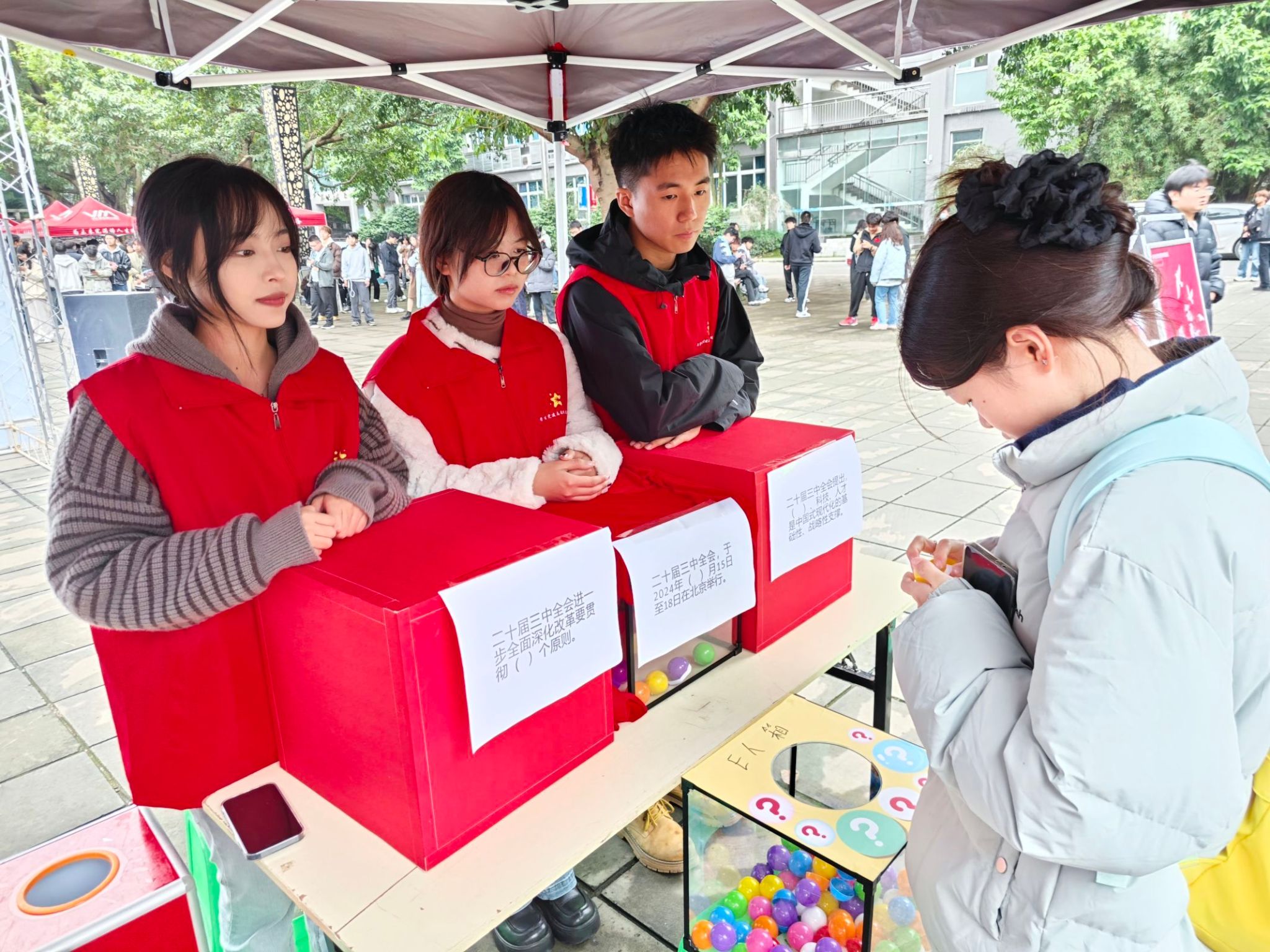然后,活动开展关于党的二十届三中全会相关的知识回答小游戏,同学们通过自己对政策方针的理解,选出正确的答案小球投进问题抽奖箱,投入后即可抽取奖品,这样趣味性的知识接触环节让得大家能深刻动脑理解到活动的意义。