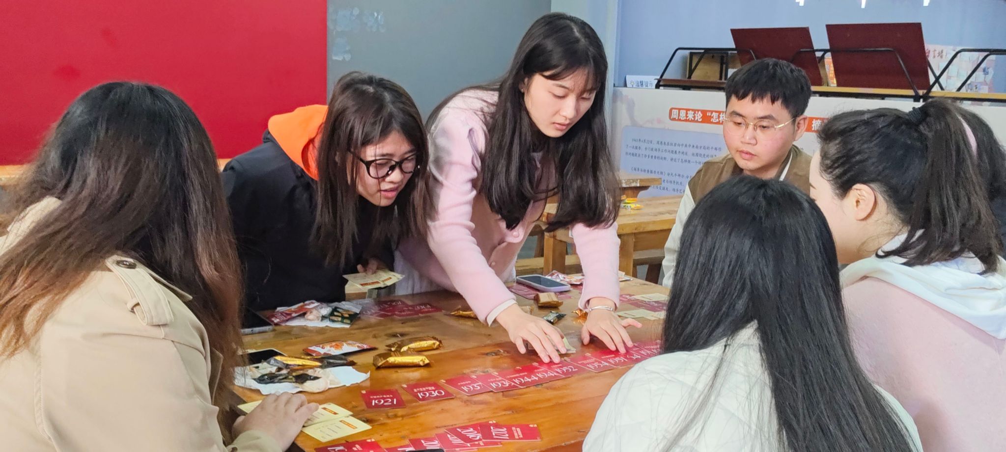 活动正式开始前,梅老师为参与学生讲明了活动规则,聪明机智的同学们很快就能上手。活动采用了积分制和惩罚制,根据各位选手所获得的年份信息匹配对应历史史实算积分,积分最高者胜出;当选手摆错桌牌位置时,会受到“惩罚”,即根据放错位置的纸牌上所标明的信息,领读并拓展学习本段历史,以此引导参与者感悟红色文化,厚植家国情怀。