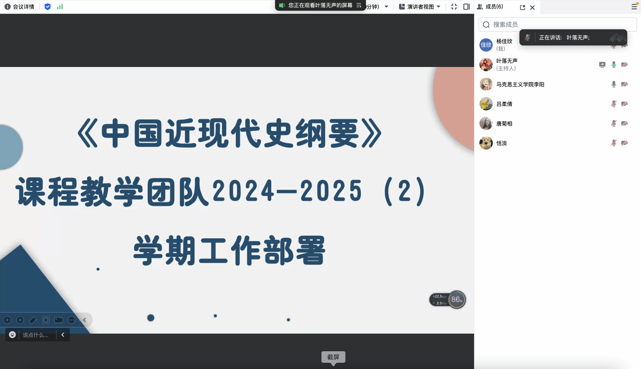 为明确新学期发展方向,凝聚团队奋进力量,《中国近现代史纲要》课程教学团队于3月5日晚上七点召开了2024 -2025学年第二学期工作部署会议。此次会议以线上形式举行,由团队带头人靳银霞老师主持,全体成员齐聚云端,共同围绕新学期重点工作任务展开深入研讨,共同擘画团队新学期发展蓝图。